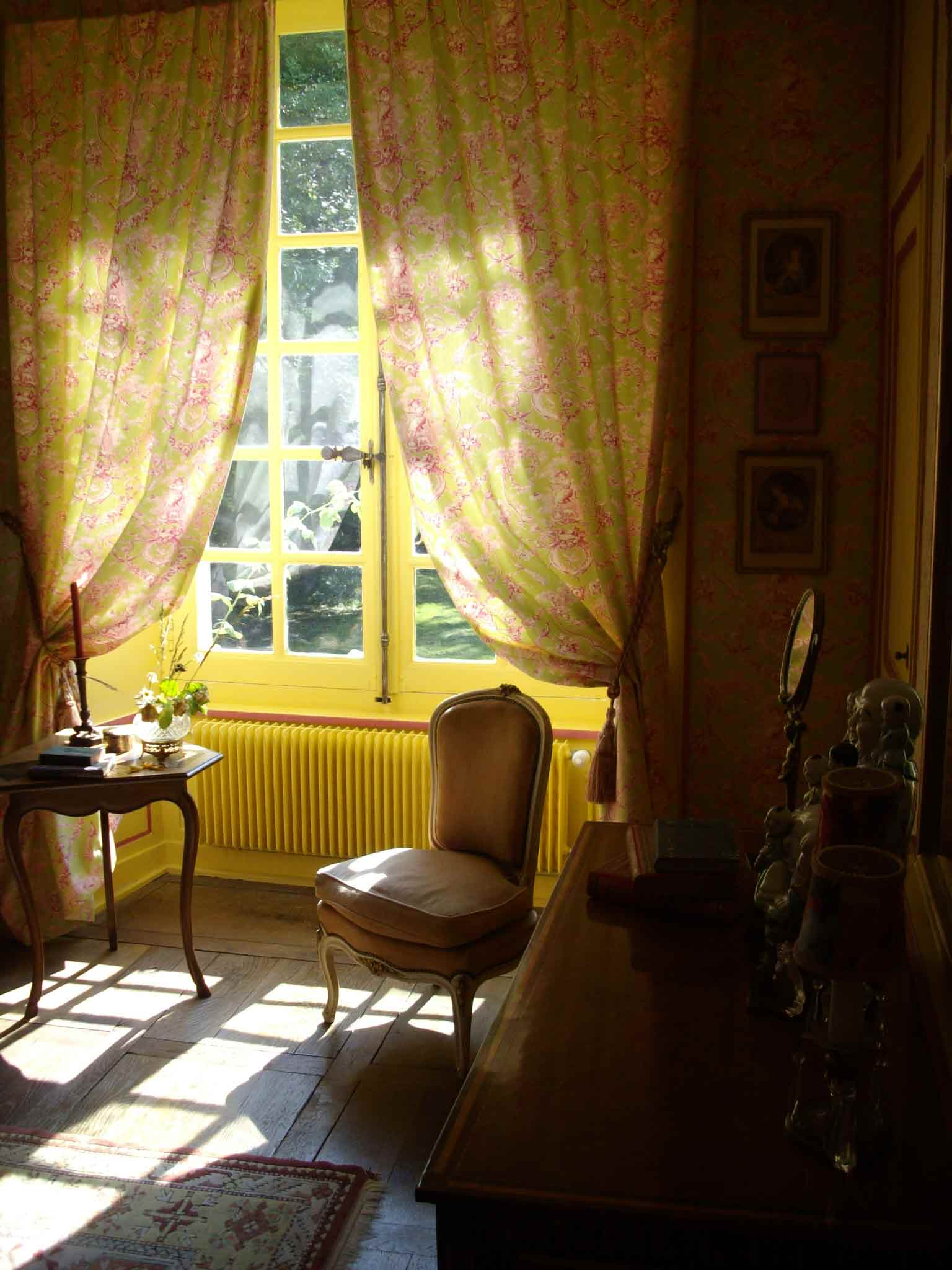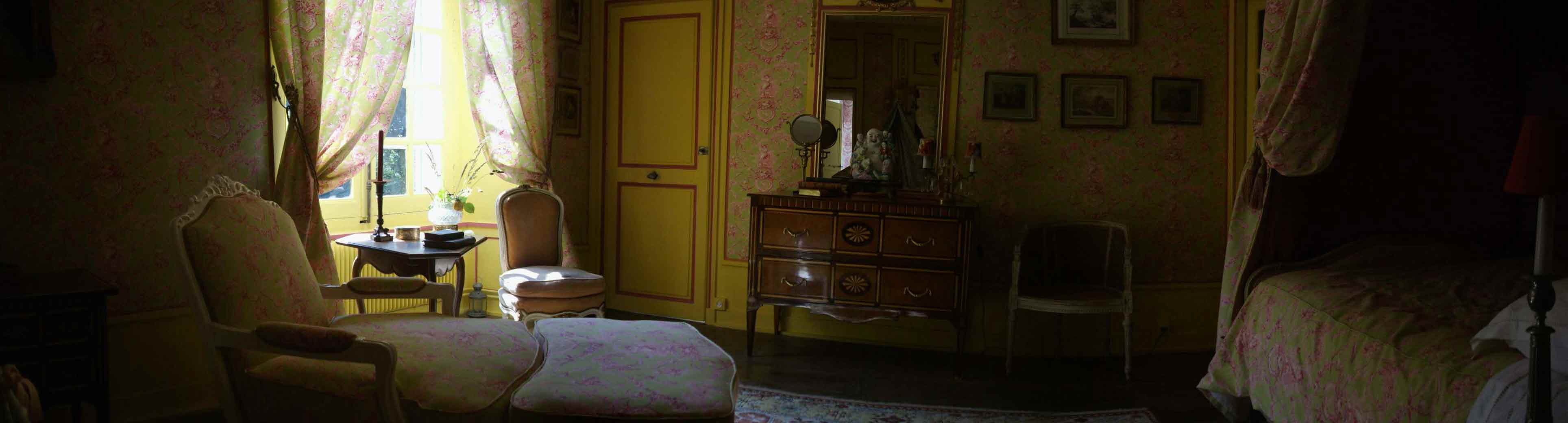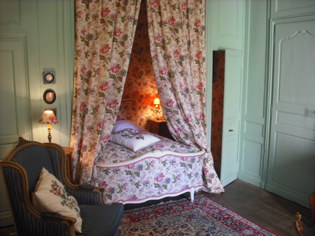 Cette charmante chambre est habitée par tous les souvenirs du château, son alcôve de boiserie date du XVIII ième siècle, elle vous accueillera pour de douces nuits, son décor précieux vous replongera dans le charme exquis de l'Ancien Régime vous rentrerez dans ce lieu par un petit vestibule, y trouverez un cabinet de coiffure, des toilettes séparées et une salle de douche.