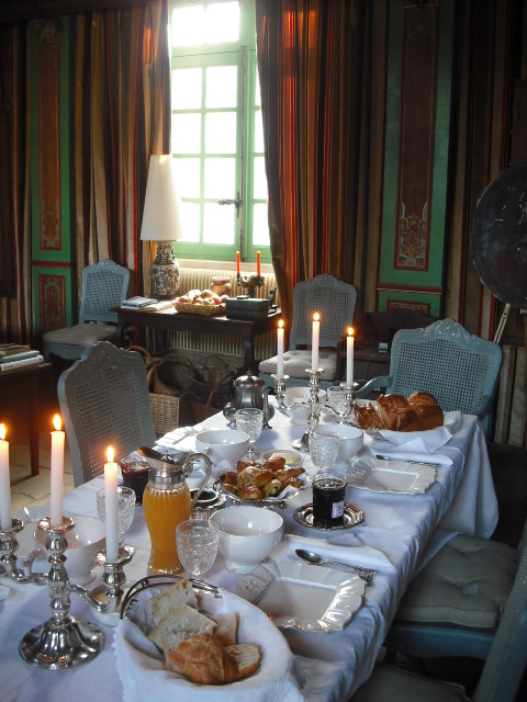 La salle à manger, ancienne cuisine du Château, avec sa cheminée monumentale, vous accueillera pour les petits-déjeuners, vous pourrez déguster sur sa grande table des confitures concoctées avec les fruits du verger, des brioches maison et retrouver sereinement une douceur de vivre...
