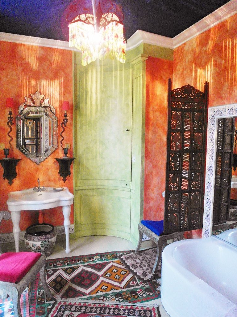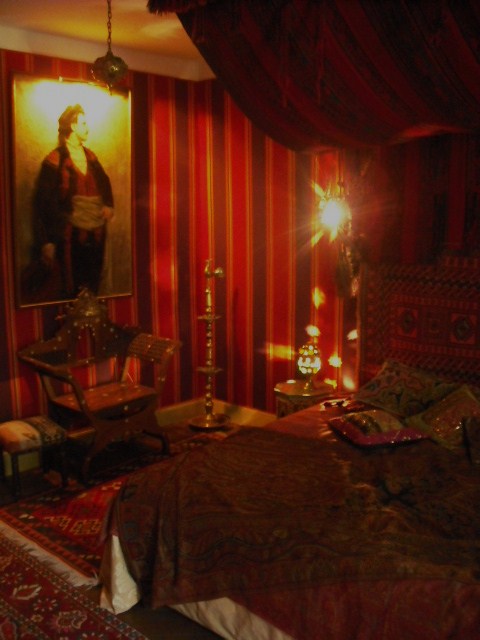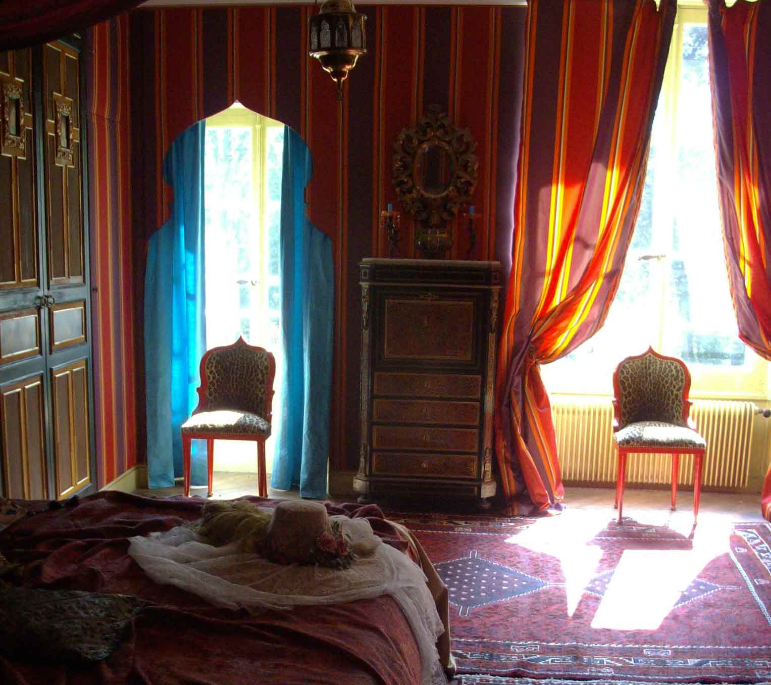 Dans cette vaste chambre l'ombre de Mosca veille sur un univers très Marco Polo, la renaissance y tient sa place avec quelques touches de mobilier syrien, vous pourrez y dormir sous un ciel de lit parsemé d'étoiles, lire dans une chauffeuse panthère ou encore profiter de la vue sur le parc et le pavillon chinois.