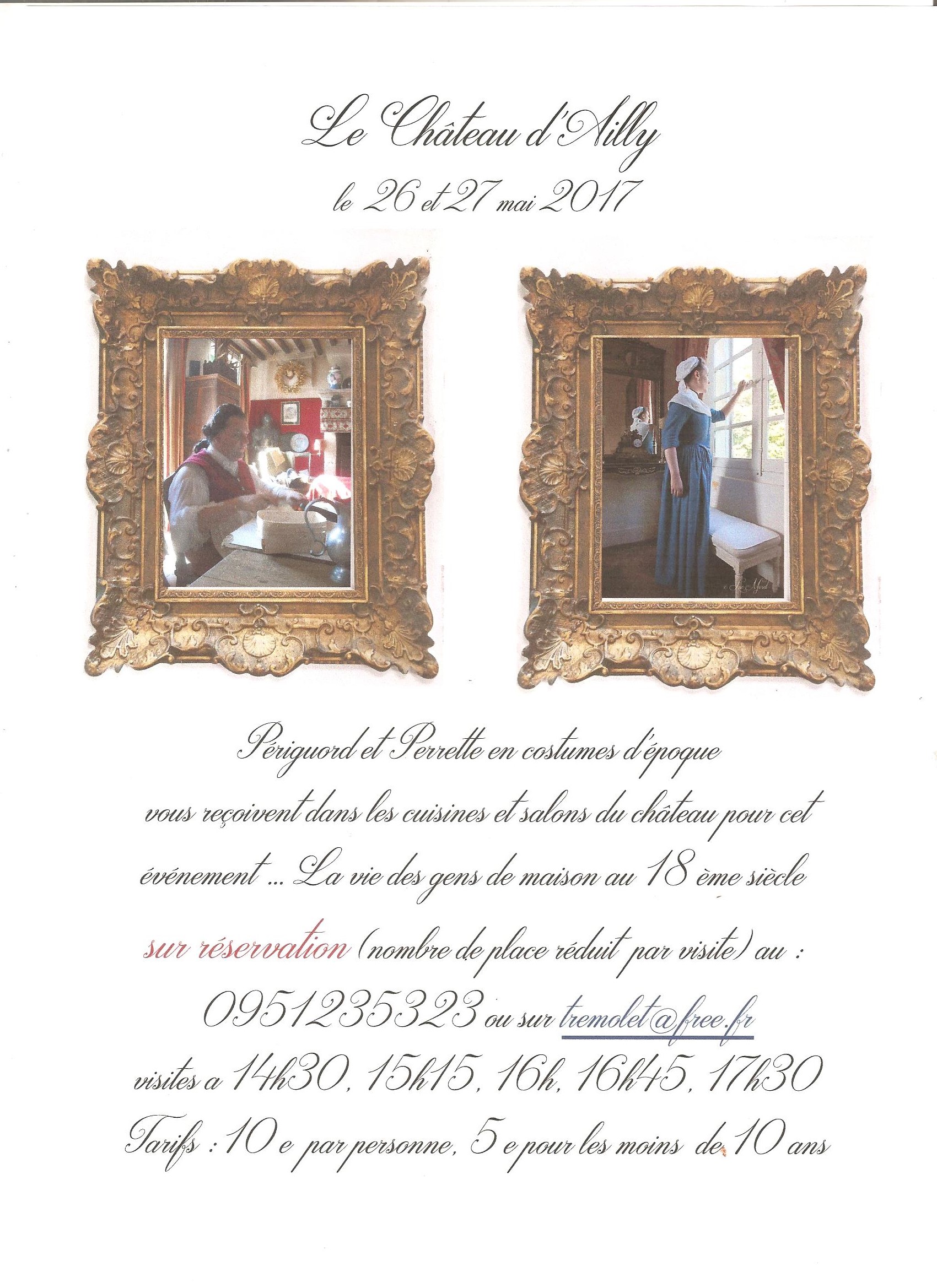 Vous serez accueillis par le Valet Périgord dans les offices où il vous expliquera sa vie, ensuite vous le suivrez dans les couloirs et salons jusqu' à Perette jolie soubrette qui vous apprendra ce qu est son ouvrage, puis une dans l'éntrée du château une page d'histoire d'Ailly vous sera comptée...